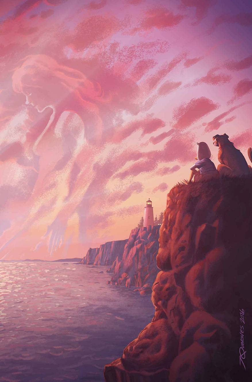 Howard has used his last punch on the Nexus of All Realities card to travel “home,” meaning to the home of his former adventuring companion and best friend Beverly. The cover of the issue sets expectations pretty explicitly, Howard and Bev’s dog, mournfully staring down a lighthouse on the Maine coast, with Bev’ likeness in the sky. The only extraneous copy on the cover reads “The Return of Bev!” so it’s obvious what we’re going to be getting here: a bitter-sweet reunion. But the first page is a charming revisit of Howard and Bev’s adventures, rendered with delightfully old time-y coloring techniques, and even using some designs that are too stupid and too sexist for modern comics.
