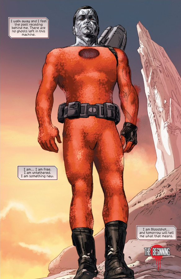 Drew: I love the premise of WALL-E — there’s something brutally tragic about the thought of the last robot mindlessly continuing his task on an abandoned Earth. Indeed, I’m so enamored of the sisyphusian hopelessness of that premise that I kind of resent that WALL-E ultimately saves humanity — his story should end with him slowly breaking down, having never accomplished anything. That’s obviously not children’s movie fodder, so I can hardly blame Pixar for going in another direction, but I still think “robot continues mission centuries after it has been forgotten” is a premise that has more thematic material to mine. With 4001 A.D. Bloodshot 1, writer Jeff Lemire takes up a variation on that premise, allowing the nanite cloud with Bloodshot’s memories to pursue, and ultimately complete, his final task.