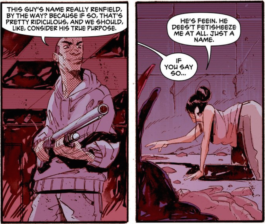I’m also sorta fascinated by Kot, artist Ricardo Lopez Ortiz and letterer Clayton Cowles choices for those symbols. Drew, you mentioned “Renfield” was not necessarily a reference that you were going to get without having your attention drawn to it. I’ll confess the only reason I got it was because I played a lot of Castlevania games when I was a kid. But I think it’s meaningful how spectacular that reference is. Not only is it too bold and weird not to be noticed, it’s not even really a classical reference. On the first page of the issue, Isobel drops a reference to MacBeth, albeit in her adorable accent: “sometheeng weeked thees wey comes.” I have to stop and read all of her dialogue a second time (accents are hard for me on the page!), but I think this one is supposed to sound wrong. It’s too stuffy, too formal of a reference. “Renfield” is a much more on-point reference for this series to make — it’s a genre book, written within the last century-and-a-half and feels pointedly more modern than fucking Shakespeare.