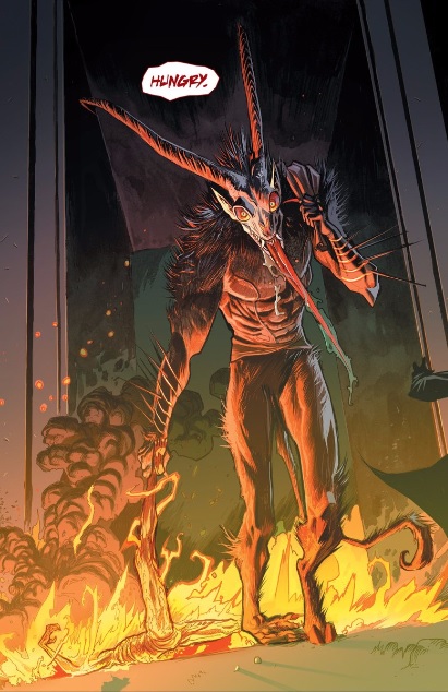 Michael: What if just responded “Yes” and ended my reply? That would be something – not today though. I think the beauty of comic books and myths in general is the way that we can ascribe meaning and symbolism to the particulars of a story; that’s Retcon Punch’s philosophy, really. The 50-foot-tall demon in question is Krampus (peeked ahead to the next solicit, sorry?), and his desire to eat children could be interpreted as corrupting them. In the same way that “The Santa” is trying to bring joy to the children by lifting their spirits with gifts at Yuletime, Krampus wants to devour the children and bring them to a place of darkness and despair. You’ll also note that like Santa, Krampus himself is carrying a large sack over his shoulder. I’m sure we’ll find out what nasty treats are inside next issue.