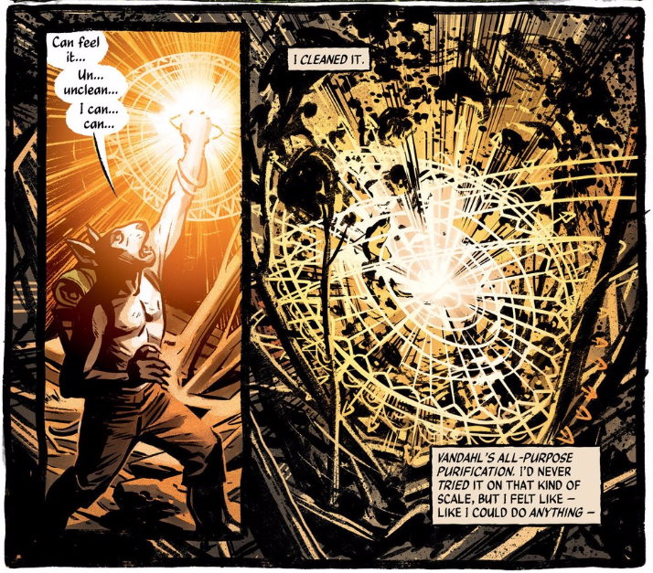 Take a look at any of the other images Patrick’s posted from this issue so far. This is about as far from Bellaire’s typical color palette as you can possibly get, but that’s the point; while Bellaire’s normally more muted color choices are part of an organic world, the brighter hues she chooses for magic immediately stand out as something unnatural and foreign to this world. The wild splotches of ink Dewey uses to depict the goat monster exploding in the second panel have a similar effect; they’re something otherwise foreign to Dewey’s storytelling skills, a power even its wielder (Rusty) can’t fully understand or control.