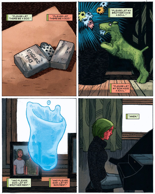 But this display of faith is contrasted with the Vision. He begins the issue trying to find a faith that would justify events, and cannot see any doctrine that can. His makes the attempt at prayer, but it doesn’t serve to help him through or bring him closer to his family. Look at how many panels emphasise his disconnect, his lonelieness. The art is fantastic, and in the end, the only thing he has is his memories of him not being there for his son.