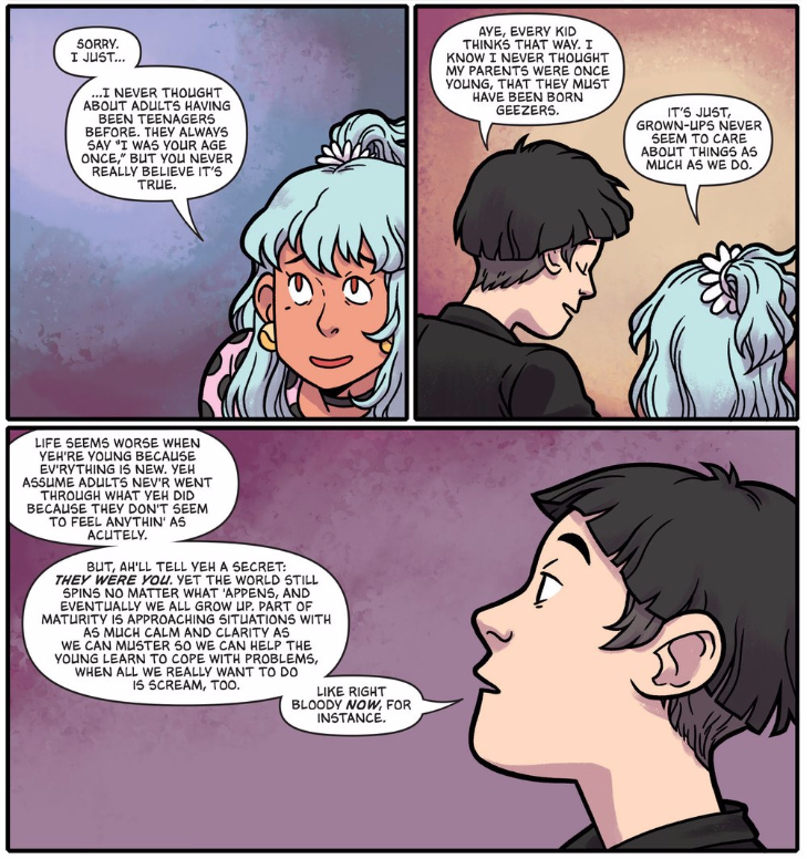 I know Taylor already posted the final panel here, but I wanted to focus more on the first two, especially Olive’s line in the second panel: “Grown-ups never seem to care about things as much as we do.” Teenagers are infamous for thinking that their every problem is a crisis of apocalyptical proportions. I think adults tend to look down on young people for that, forgetting that we ourselves, without the benefit of age and experience, once felt exactly the same way. So I appreciate Professor MacPherson being so patient and understanding with Olive in this regard.