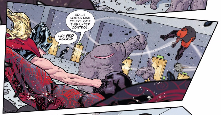 Now I wouldn’t say The Mighty Thor 10 is “a” comedy, but comedy certainly informs almost every aspect of this issue. The goals, skills, and dialogue of the characters — from the Roxxon guard’s speech to Kurdle and Krill’s absurd tunnel vision to even Sir Ivory Honeyshot’s choice of weapon — are so thoroughly over-the-top that they can’t help but to elicit a chuckle. And thankfully, the characters themselves generate much of the humor naturally: each antagonist has an entirely different agenda, and cares about nothing but achieving it. Agger wants to escape, Exterminatrix wants to kill Agger and doesn’t care if New York dies in the process, Kurdle and Krill are too focused on Thor to care about anything else; the way these various agendas clash and overlap, with only poor Thor and Roz Solomon capable of even trying to clean up the mess, generates some great laughs, but it also sparks some even grander action.