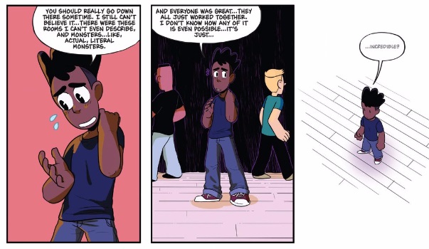 Tynion’s choice to set this story at an all-boys school helps make the gay default that you mentioned earlier simpler. It also forces Jory to interact with boys, challenging him. Based on that first page, we can assume that Jory has been friends with girls up until this point. Pretty much all we know about Jory we have to assume. Jory is a passive protagonist for much of this issue. He chooses Drama Club, but we are given no insight as to why he is attracted to the stage. Without knowing his motivation, his turn to choose the Backstagers lacks any emotional resonance. The plot of the story can be simplified to: new kid at school meets some snobs and then a group of friendly people and decides to hang out with the friendlies. If we don’t have any reason for Jory to want to be with the actors, there are no stakes to his decision. It’s a shame, because Singh gives us a pretty cool visual representation of Jory’s realization that he belongs with the weirdos.