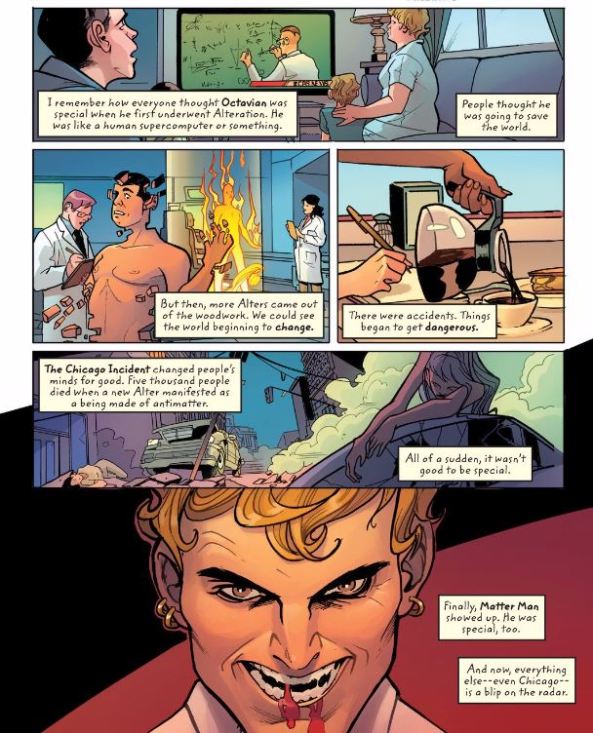 Because Jenkins is forcing so many broad strokes in just a few panels, none of them have any resonance. Without scaling the story down to a human level, it’s all general truths that don’t evoke anything of meaning. Anyone of these panels being built out into a scene could have made the story more engaging. What specific ways did they think Octavian could save the world? How did the new Alters change the world? Even the Chicago Incident doesn’t pack the punch that five thousand deaths should. The image of bodies strewn across a smoke-filled street should be devastating, instead is feels rote. The choice to deny any specificity in these images robs them of impact.