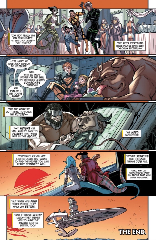 Those are the exact traits that James Asmus and Rhoald Marcellius focus on in their grand finale. As the issue opens, much of the cast are feeling isolated — work distracts Crystal from her daughter, Gorgon’s son is still in a coma, and Swain’s purposely cordoned herself off for fear of unintentionally manipulating others — and it’s only by trusting their crewmates and opening themselves up to their friends that they can begin to heal. Not every problem is solved in this issue, and not every dangling plot-thread is resolved (I’m curious to see if/when the Sky Spires will be addressed again), but it’s a powerful, positive step in the right direction.
