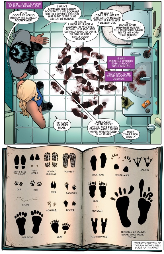 The page from The Boy Scouts Guide to Field Guide to Tracking acts as an exploration of a Hunter’s line. There is something really confident about using half a page not just to contextualize a joke, but to explore it’s implications for half a page without furthering the plot. It’s the attitude of, “I think this will be fun, so I’m going to show it to you.” The little moments like this, or the flight of fancy about Cruise Ship Bootcamp are not only fun, but they give us insight into how Bobbi’s mind works. During her investigation, she presents herself as a capable and focused super-spy with little time for nonsense, whereas the reader knows there is someone really clever and fun beneath that veneer. Which makes it all the more upsetting when her mask slips for a moment when  Lincoln Slade touches her. Her expression becomes uneasy and you can see her fear. Of course, she quickly regains an angry sort of control, but we know that this confrontation isn’t easy for her. It’s a great place to leave the issue, because we know both that Bobbi will handle him like a boss and that it will be an internal challenge.