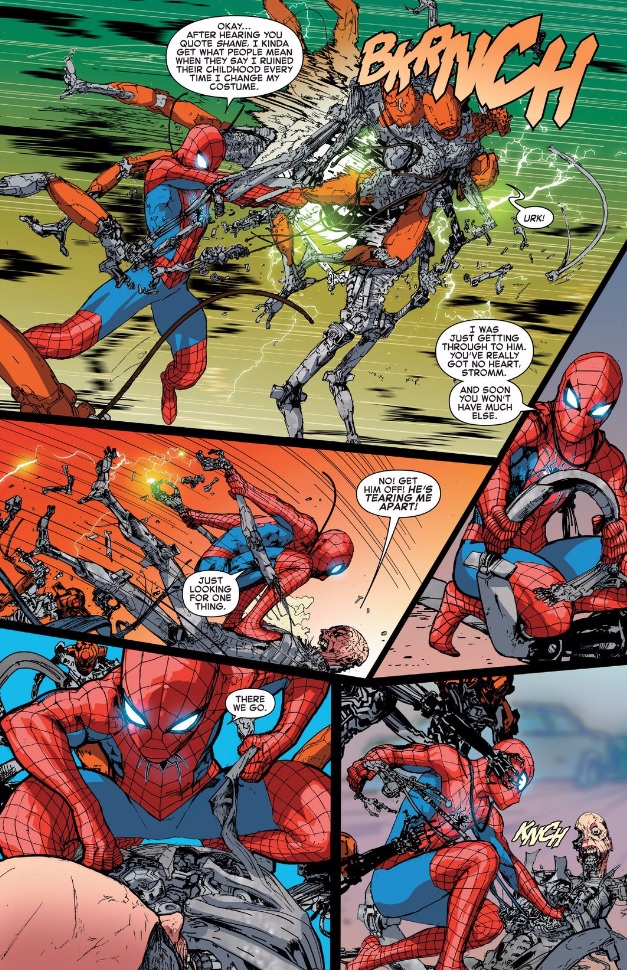 layoutTake a look at panels one and three here, for example. In the first, the slant of the panel and the motion lines emphasize Peter slamming forward into Stromm, while in the third, the slant and motion lines emphasize the backwards motion of his ripping Stromm’s cybernetic limbs off. This particular page is one of Foreman’s more dynamic layouts, to the point where it might be a little confusing if not for letterer Joe Caramagna directing the readers’ eye in the proper direction. Essentially, this whole team is firing on all creative cylinders. This series will probably have more effect on Amazing Spider-Man than Civil War II going forward, but ultimately, I think it will be remembered as one of Civil War II‘s strongest tie-ins.