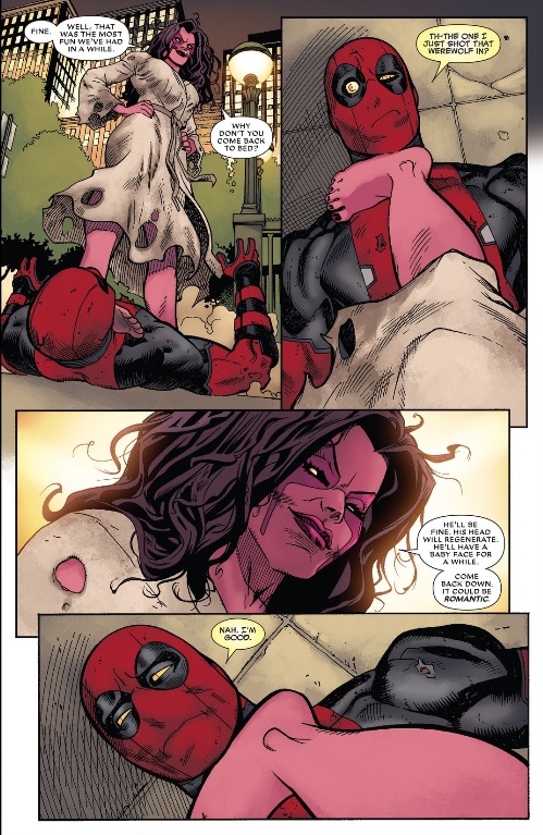 For being a crazy person, Wade is kinda sorta making some healthy life choices for himself in Deadpool 18. After he kills the Werewolf that was sleeping with Shiklah, she beats the ever-living crap out of him. She seems amused by the end of it all and asks Wade to come back home with her. Wade – a man who’s spent the better part of his life being a bad punchline – wisely declines.