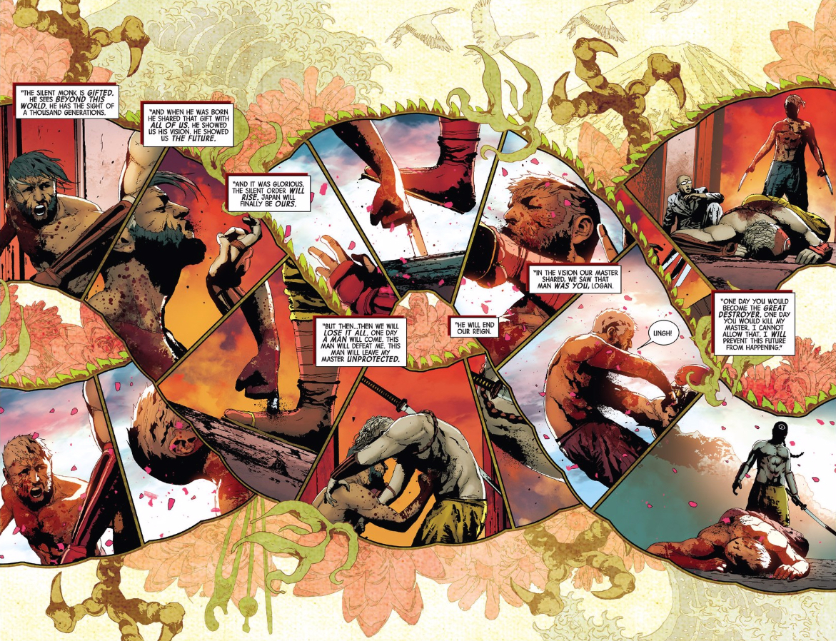True to form, artist Andrea Sorrentino sees to it that every issue has at least one show-stopping layout, but I might argue that this one takes on unique narrative significance. The page leading into this finds Logan and his foe engaged in seemingly identical fights in both timelines: his original, Old Man Logan timeline, and the current one. We can think of these as moments of reminiscence or deja vu for Logan — he lived through the first fight, and can remember it during the second — but we can also think of it as an alternate reality version of the same fight (the perspective his adversary might have of these two threads). The result is something that couldn’t adequately be expressed in prose or on film — particularly as the fights diverge into seemingly opposite outcomes.