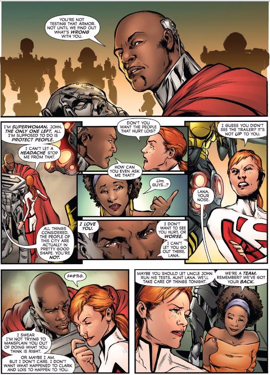 There was one sequence that attempted the relationship and character-based conflict that can be more emotionally affecting. When John tries to forbid Lana from continuing to fight until her health is secured, we have the issue’s only instance of conflict rooted in information that we knew going into the scene.