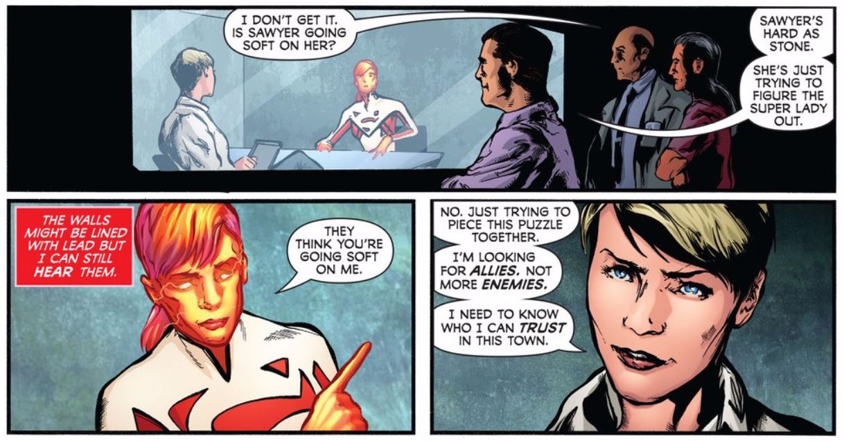 This is another story element that could’ve been more powerful if given room. We get hints of the police department’s conflicted feelings about the caped, but Maggie just immediately trusts Superwoman, even while both admit that they know she’s lying.