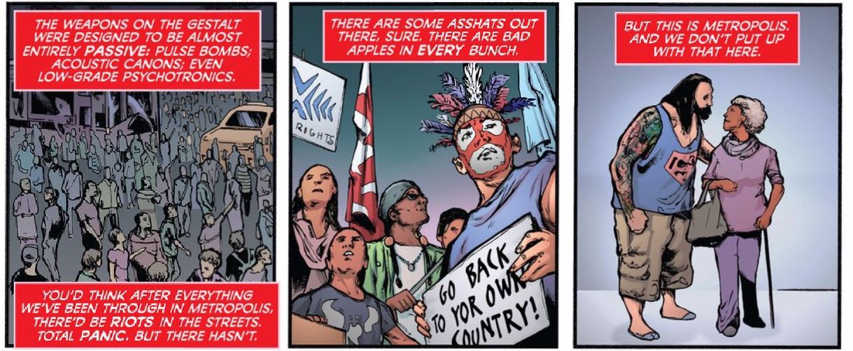While there needed to be follow up to the launching of the weapons, this reads like an epilogue to a story we didn’t get to see. The strange political point in the second panel doesn’t really follow either. Is the “go back to your own country” protest a response to the weapons fired by Lex’s ship? If the point is that the city carries on with kindness rather than panic, that’s something that could be shown more dynamically. This is just the first of several beats of this story that feel like they could be explored in an entire issue. The image of the hulking man in the Superman tank checking in on an old lady should have more resonance, instead it is just shorthand for Jimenez to take our focus away from the tensions he raised on the first page so that we can focus on Steel and Superwoman at the jail.
