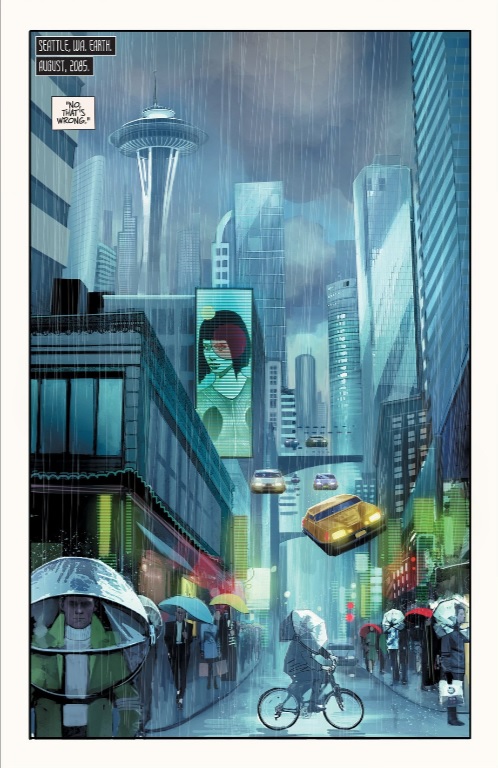 Michael: Damn you Patrick I was trying to think of what sci-fi future Rod Reis’ Seattle evokes but you beat me to the punch! But yes, the full page intro to future Seattle has Blade Runner written all over it: flying cars, Tokyo aesthetic and plenty of rain. I like the balloon umbrella’s that many of the people on the street seem to have as well. Naturally that leads me to imagine a bunch of balloon umbrella folks bouncing off each other and the walls as they try to pass by in tight corners.