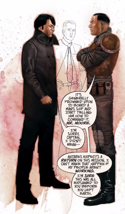Simon and Annabelle’s relationship – or lack thereof – is the main focus of this issue but I do still loves me a good mystery, so I want to know how Edward really died. Simon seems to suggest that there was foul play involved and Annabelle assumes the company wants him to “phone it in.” Are we clear on what Simon does as an investigator, exactly? Is he like an insurance appraiser for Antares? He seems to be ridiculously good at his job like any TV detective working a crime scene – is he a criminal detective savant? And the ship’s named Hadrian’s Wall, implying its defending Earth from something – are they military? So many questions Mrs. Higgins and Siegel! I guess I’ll have to check beck next issue.
