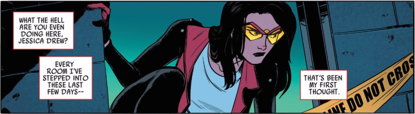 • I agree with you. However, Jessica does have a tendency to sink into depression – but generally those bouts tend to be caused by huge events (see post Secret-Wars and Bendis’ Spider-Woman Run. Also, Jess after Carol lost her memory in Enemy Within). I wouldn’t say that depression is a hidden reason that Jess breaks up with Carol. But I can see all these events (Banners death by Hawkeye, and breaking off her friendship with Carol) could lead to Jess becoming depressed. This time though, Jess has people she KNOWS she can fall on.