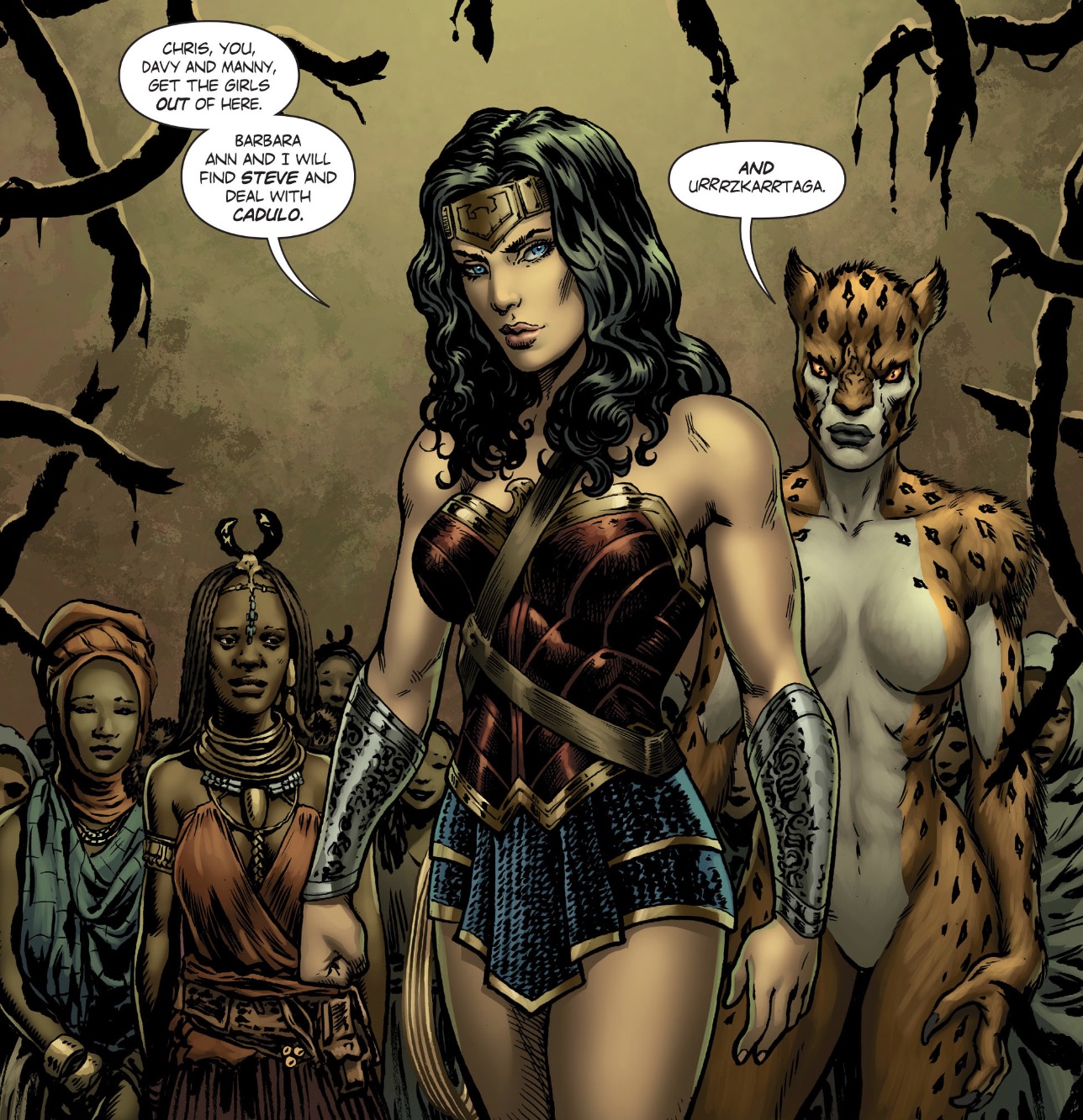 Wonder Woman and Cheetah have caught up with Caludo’s men and they’re able to reverse the #BringBackOurGirls narrative before the title page even hits. Artist Liam Sharp absolutely rules this page with some amazing captive imagery, carefully laying out a cage-as-panel-divider theme that he’ll return to later in the story. Since this particular cage is literal and physical, it doesn’t really stand a chance against the mighty strength of Wonder Woman.