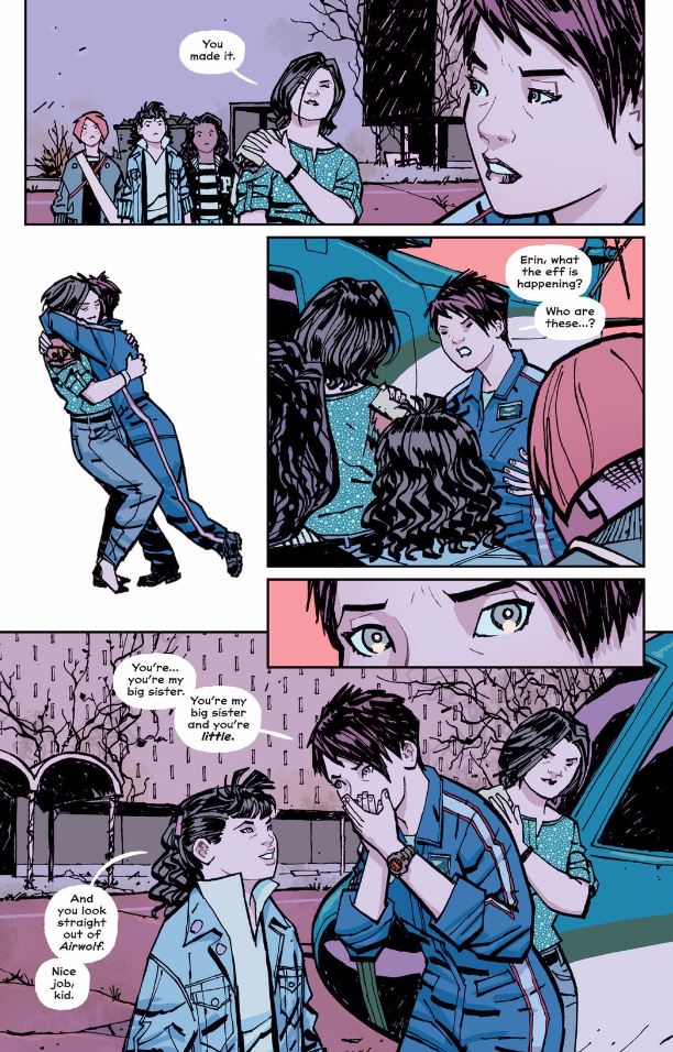 There is a lot to Paper Girls. We have time travel and flying dinosaurs and a weird leader who is collecting girls and putting them into suspended animation in jars. The mysteries are fun and offer something unexpected in every issue. But, more than the fun of those surprises, the story offers moments of real connection between the characters. In addition to Missy and her (younger) older sister, we see Mac and Tiff exchange “I love you’s” and the girls reunite with KJ. I may want to know who carved in to KJ’s field hockey stick or the meaning of the symbol on the mountain, but I love Paper Girls because of the humanity of the characters.