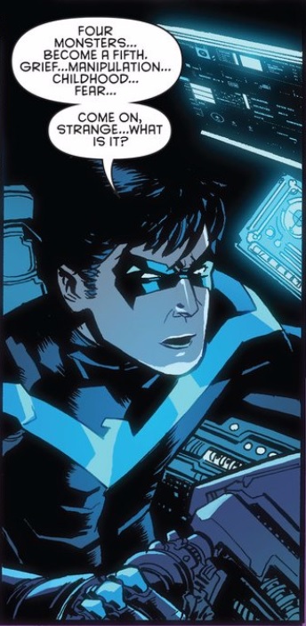 As for Strange’s philosophy, he seems to have allowed his obsession to push him into a place wherein he both celebrates Batman and believes him to be weak. There is a cognitive leap between analyzing a subject, understanding his weaknesses and failures, and then believing that you are the next step in evolution, as Strange contends. Again, the issue doesn’t state Strange’s position in a very clear way. The end of the issue contends that Strange saw Batman’s ego as his weakness, but Strange didn’t appeal to ego. Even when referencing dead Robins, Strange’s position is that Batman is too weak to protect the ones he loves. That doesn’t jibe with either the common meaning of ego or the psychological definition. Strange is a victim of both his own sense of self-importance and his inability to see reality.