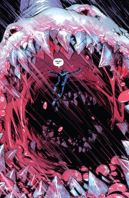 As far as I know everyone loves our boy Nightwing, so it’s always nice to see him save the day in a big way like he does here. After the team realizes that the Watchtowers’ lasers aren’t doing the job, Nightwing decides to abandon his post and literally dive into the belly of the beast. It’s an epic visual, as Dick free falls into a Sarlaac-level of a toothy chasmy pit.
