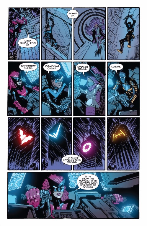 Nightwing, Batwoman, Spoiler and Orphan take on the final (fifth?) monster in an epic smash-em-up while Batman takes on Hugo Strange with a little bit of help from Clayface. Writer Steve Orlando has made mention of “The Wayne Watchtowers” in earlier chapters and we finally get a good look at them. It’s probably no coincidence that Andy MacDonald stages this scene like the part of a Power Rangers episode where they do a Mega-Zord roll call. Each tower lights up with its heroes’ respective logos and arms itself with laser cannons.