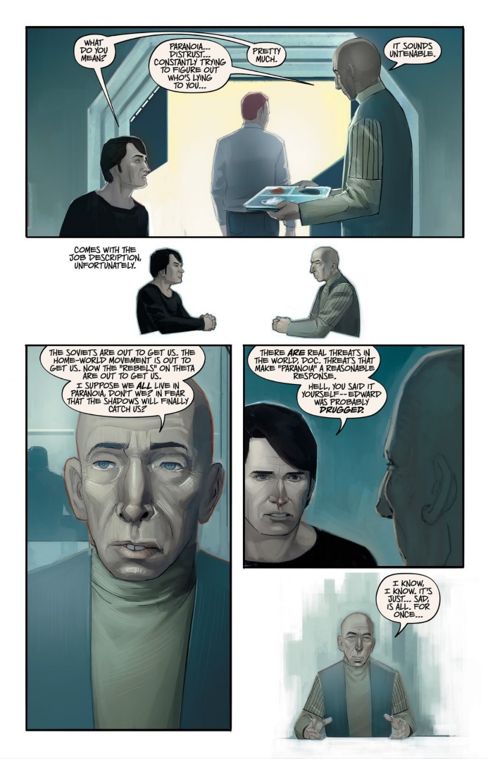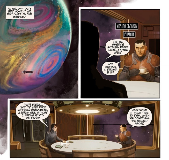 While this is nothing novel unto itself, the colors and swirls of space and the planet’s miasma spreads from the image into the gutters around the adjacent panels, giving me the thematic idea that, no matter what happens between characters, everything which takes place occurs under the broader context of a spaceship, in space. This also reminds my brain that, while the plot stays firmly grounded with inter-personal dynamics, there is no firm ground afoot. A lovely little touch.