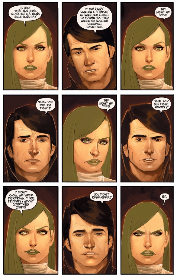But what really sells the tension between Simon and Annabelle is Reis’ staging. This page is nothing but nine consecutive close-ups. The camera is so close to each character’s face that it’s uncomfortable. The panels are so close together, the same shot in each so constant, that it again just feels uncomfortable. This page suggests familiarity and intimacy, but also discomfort. Simon and Annabelle’s former closeness is only making this process more difficult for them both.