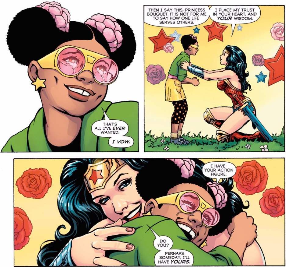 This issue is a true anthology, featuring short stories, pinups, cover sketches, an “interview” with Diana, even a poem (or is it a song?), from some of the character’s most notable recent creators (past, present, and maybe future). Indeed, the issue is too full to name everyone, but all do a fantastic job of highlighting exactly what has made Wonder Woman such an enduring figure: her compassion. Virtually every story, from Diana defending Giganta from an angry mob (whom Diana had just saved from Giganta) in Mairgread Scott and Riley Rossmo’s “One Side Alone,” to Diana pulling the thorn from her adversary’s paw in Renae De Liz’s “The Legend of Wonder Woman,” finds Wonder Woman finding compassion even for her bitterest enemies. I was particularly moved by Brenden Fletcher and Karl Kerschl’s short story “Predators,” which finds Diana extending that compassion to the animal kingdom (and makes a strong case for an animated Wonder Woman film). Gail Simone and Colleen Doran’s “Big Things One Day Come” also finds Diana helping an animal, though her uplifting pep-talk to an aspiring superheroine definitely steals the show.