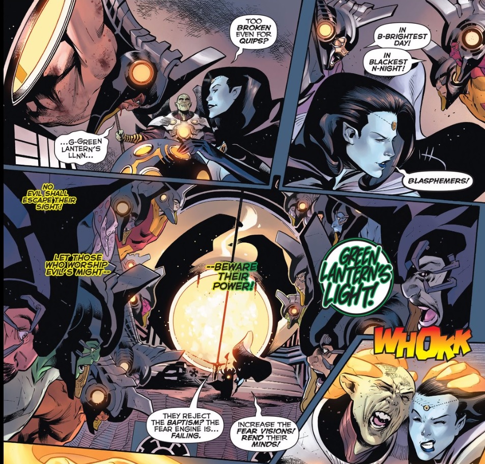 Ever since being captured, Guy has endured courageously through horrific torture, replying to his captor’s taunts with nothing but sass and his Green Lantern Oath. There’s literally nothing else Guy can do, but his defiance hasn’t been for naught. Just as his body is about to give out, Lyssa’s other prisoners join in with Guy, transforming their fear into will (displayed quite inventively by letterer Dave Sharpe, who has the colors surrounding their words transform from yellow to green as they overcome their fear) and quite literally draining much of Sinestro’s power in the process. Sinestro’s power can only come from the suffering of others, while the strength Hal and Guy display is borne of confidence, courage, and self-improvement. Again, while Hal may do the heavy lifting by actually physically defeating Sinestro, his loss begins in this room with the absolute dismantling of his belief system.