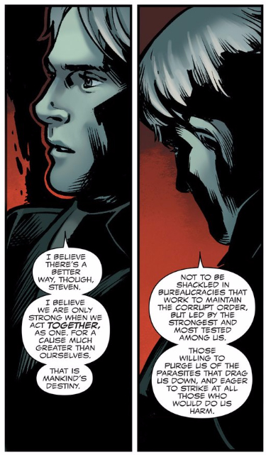 After all, Kraken isn’t entirely wrong about the circumstances that drove Steve’s father to abuse and alcoholism (although those circumstances certainly don’t excuse it). Steve has legitimate gripes against capitalism, and even America. Kraken’s next move, then, is to present a “better way,” a way to fix those problems and live a better life — a way to “Make America Great Again,” you could even say.