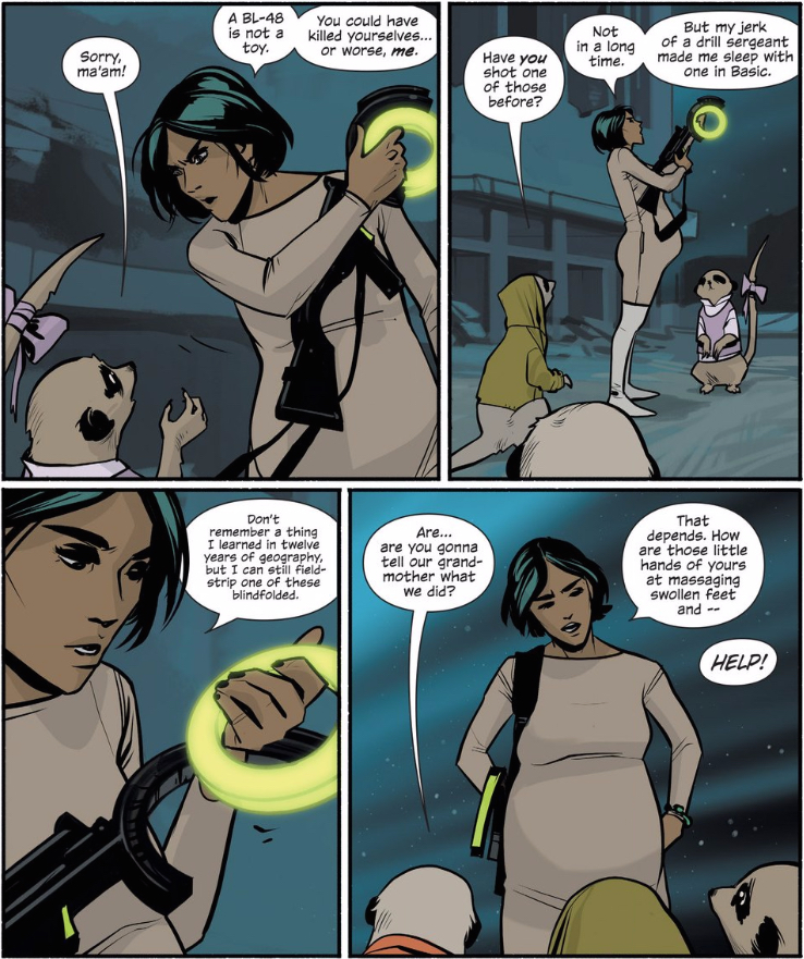 Oh, man, I can’t believe I never mentioned the “Or?” line! I’m starting to suspect a super-cynical reveal that the war is actually a 1984-like means of keeping the populace in check (or at least keeping resources flowing to the top), so the leaders on both sides are colluding to keep it going. It would certainly explain why there is so much interest in Alana and Marko — if people learn to just look past their differences, there’s no more war to exploit. It’s a little conspiracy-theory-y, but it actually feels like the kind of pull-wide reveal Vaughan has pulled with other series in the past. Also, it feels very much in line with the themes of war and exploitation he explored in We Stand On Guard.