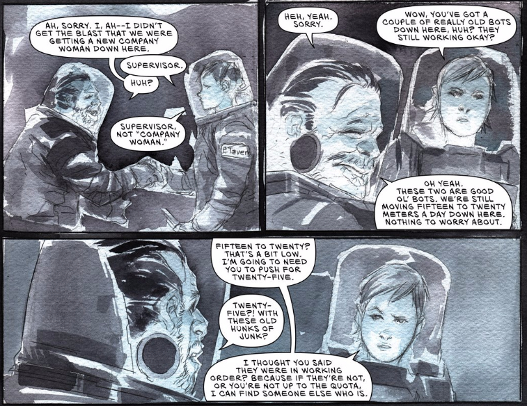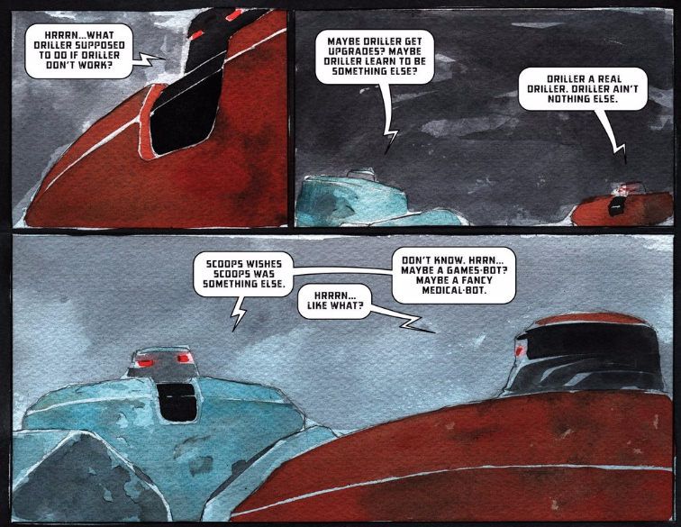 Driller and its partner, Scoops, are greeted on Dirishu by Henry Tusk, who plays a very important role in Driller’s formative years. I appreciated the little nod to QuonTech’s new personality upgrade given to these two robots, explaining why they were written as finding their voices. Tusk is not a bad guy, nor a good guy — he is a man who chose a brutal job in off-planet mining to support his kids. Is he super nice to Driller and Scoops? Not particularly, but hey — these are robots. One doesn’t get angry if a person kicks a jackhammer in frustration, so why would we judge this man for treating his equipment like the machinery they are? We get to see more of the robots’ personality in the moments when the two are charging after work than Tusk ever got to see in the five years he spent digging with them. One page shows this time lapse very well: