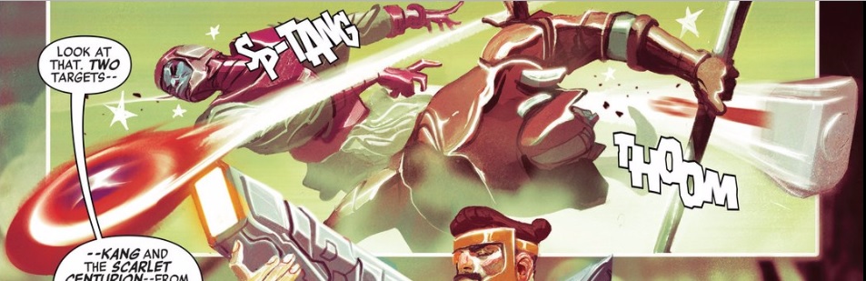 My favorite technique of del Mundo’s this month, though, is how he depicts motion, especially when it comes to projectiles. There aren’t just speed lines following Cap’s shield or Mjolnir; the weapon themselves blur as they pick up speed and power. I’d check out just about any title if del Mundo was doing the art, and his work in Avengers 1 doesn’t disappoint.