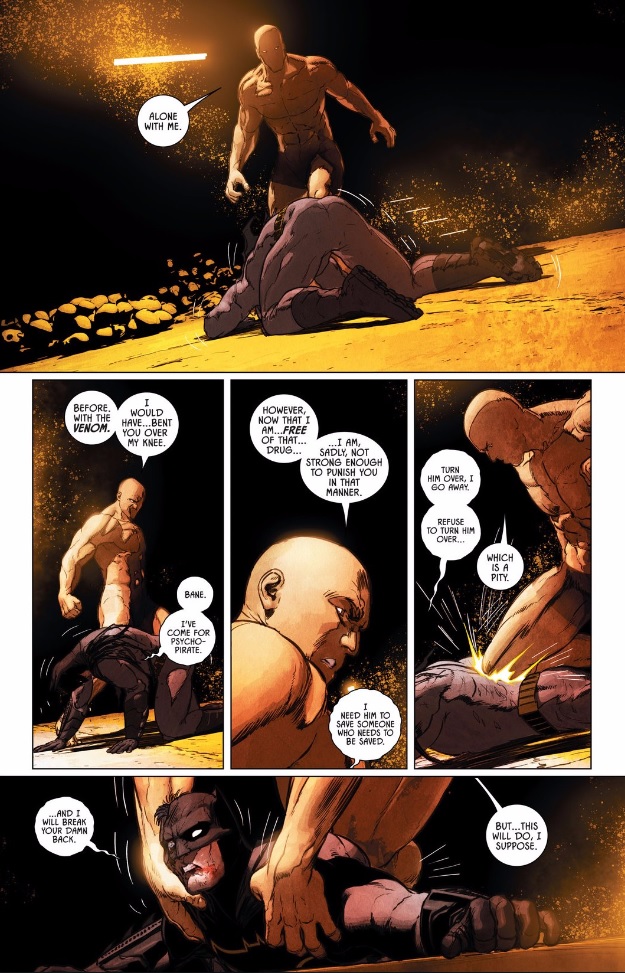 Mark: I’m all for Janin beefcake, and I think here it’s used to emphasize just how powerful and in-control of the situation Bane is. Stripped of everything, and operating without Venom, Bane is still able to overpower a fully equipped Batman.