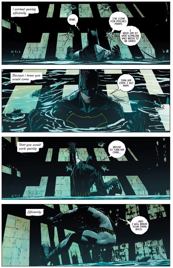 The question I have is: how is Batman able to bring back into action after Bane fucks up his back? There’s a big panel later in the issue (when Batman is the room filling with water) where it looks like he’s maybe cracking his own back in the opposite direction. But like… that’s not how backs work. It REALLY didn’t make sense to me.