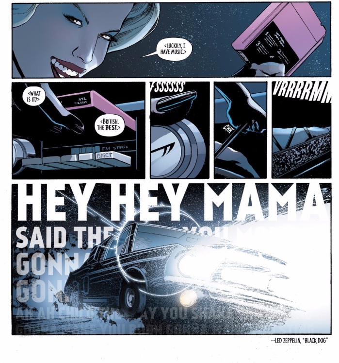 Another thing which intrigued me was the use of music in the comic. De Campi, at the end of the issue, writes extensively about the choice of music featured diegetically within the piece. I really love this; the more senses engaged by a work of art, the better (normally). The last title I saw play with this idea of music was Ales Kot’s Material, but there is a huge difference in the function of music between the two. In Material, music was used primarily nondiegetically — i.e. for the reader/audience instead of being experienced by the characters inside the story, or as a sort of didactic means of adding flavor or subtext to the moments. Here, the songs are part of the world of the comic, and influences characters while giving thematic clues to the reader about what to expect.
