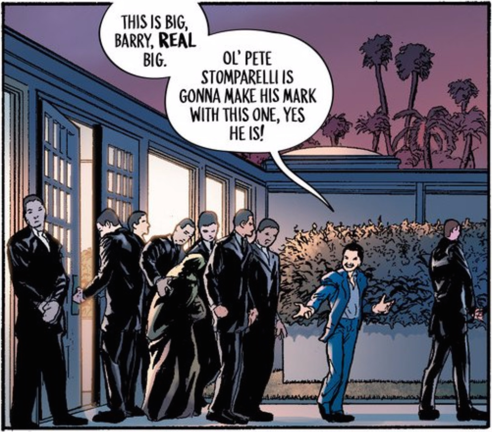 Which brings me to the other non-rational actor in the story: FBI Palm Springs SAC Pete Stomparelli. We get to know exactly what kind of “bureau yahoo” he is throughout the issue, but Parker and colorist Blond make it clear from his introduction — notice how Stomparelli’s casual blue suit sets him apart from all of the other agents: