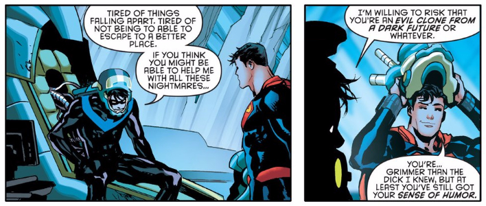 It also helps to retroactively justify why Dick’s been so unusually angsty throughout this run. With a “new” Superman flying around, I admit that I’d kind of forgotten about the death of the New 52 Superman and what it might mean to those around him, but as this issue shows, Dick’s been positively shaken by the death by one of his closest friends and greatest role models. Throw in the death of Red Robin as well and you’ve got a the perfect recipe for some sad, sad times.