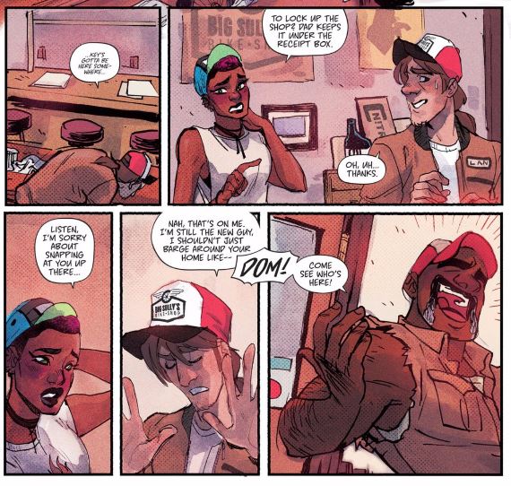 Dom is blushing and awkward as she talks to Lan. It’s a very brief conversation, but the embarassment they share here felt more authentic than much of the bravado that Dom expresses later in the issue. Then again, she doesn’t seem to care that much that he is killed in a Crush-combustion in front of her eyes. This takes us back to the Crush and what it means to her. She is willing to put aside her basic humanity to make finding Crush her mission.