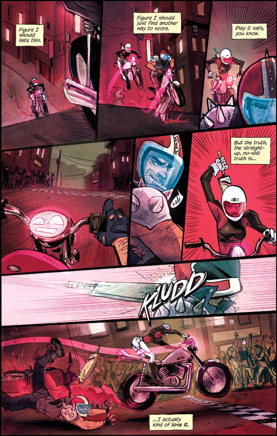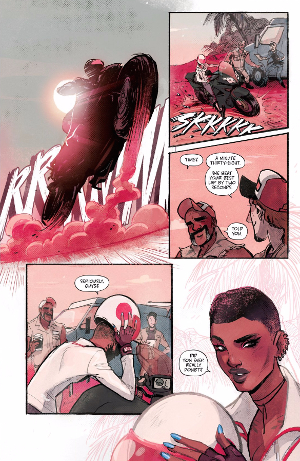 We’re introduced to Domino Swift as an up-and-coming motorbike racer, hoping to carry on the family tradition of racing. The creative team of Brenden Fletcher, Cameron Stewart, and Babs Tarr know how to communicate that clearly and efficiently, giving Dom one hell of a heroic entrance: