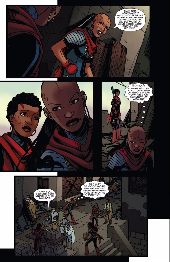 The opening page looked great with its panel composition and set up the devastation of the city and the Dora Milaje’s unenviable but crucial role clearing the drowned and deceased from the city. Then we arrive at this page, where the audience understands the tension and dynamic between the two leads from the volatile and passionate Ayo and the dutiful and discerning Aneka from the first panel, see how the interaction effects them in the wonderful, silent second panel, before Roxane Gay felt the need to throw in thought bubbles saying exactly what the audience perceived from the first two panels she created! Maybe I’m getting really hung up on this, but just imagine the page without the bubbles. No, wait, even better: