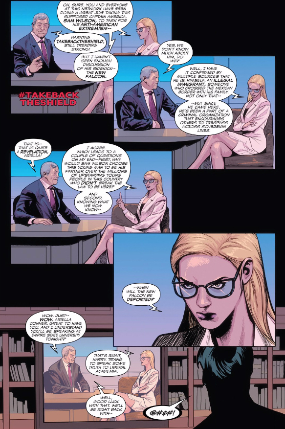 And honestly, that is the same here. Ariella Conner is shown as a horrible person that is unsympathetic. We here both sides, and she is still shown as a horrible person that is never, ever vindicated. The protesters outside aren’t treated as villains (and are in fact fans of Sam), and Joaquin’s actions are shown to be hotheaded, but ultimately from the right place. Sam Wilson learns that he has been too restrained lately, and asks Rage to push him so he never gets comfortable. The only meaningful difference between Joaquin and the Bombshells is that the Bombshells throw grenades. There is nothing in this comic that doesn’t say that we should make a point to stand up against the Ariella Conners in the world. Nothing says we should simply let them speak and see where things go. The constant theme of this book is the need to act, since the very first issue where we learned that Sam is controversial because he refuses to keep quiet and look pretty (again, Sam actually asks Rage to keep pushing him so that he keeps acting and pushing the envelope)