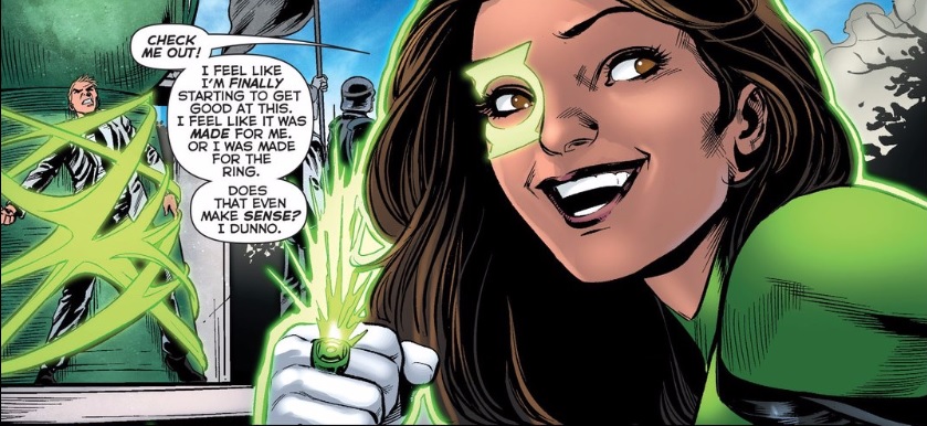 Back in Green Lanterns 10 I criticized artist Eduardo Pansica’s portrayal of Baz trying on the phantom ring and cycling through the emotional spectrum. That same effect is used here when Jessica puts on the ring, so at least the guy’s consistent. This series has a humor and heart that speaks to me, sold by the joy that Pansica draws in Jessica and Simon’s faces. I’m as tickled that Jess saves the day with her wobbly constructs as she is. If she’s as much of true GL as the phantom ring is suggesting then shouldn’t she be forming some legit constructs by now? What’s taking so long?