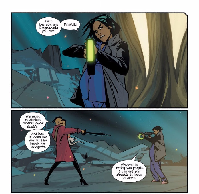 Hazel, for a four year old, certainly has spunk. The narrative voice of Saga, as it seems fair to say, belongs to her, and I thought her words regarding the amount of violence digested by children to be quite perspicacious. Nail Gaiman, as an author, has spoken about writing horror stories for children, acknowledging that a nascent part of childhood is fear. That being said, Hazel, being the child of what is essentially a war crime in a torn galaxy, has seen a bit more than most children, and the showdown between Alana and The March is no different. The physical tension here is heightened by the obvious baby bump of Alana’s: