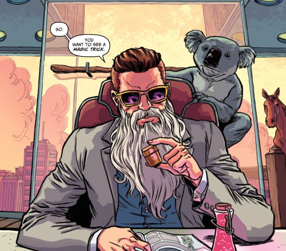 A kind of hipster-y wizard who has set up a magic-for-hire service in a Manhattan highrise, we quickly learn that he’s more or less capable of anything his clients can imagine. Anything, of course, that doesn’t violate one of his three rules: no cures, no wars, no love. Those rules don’t seem particularly pertinent in the moment, but like the ballon/baggie distinction, may prove to be key for this series going forward.