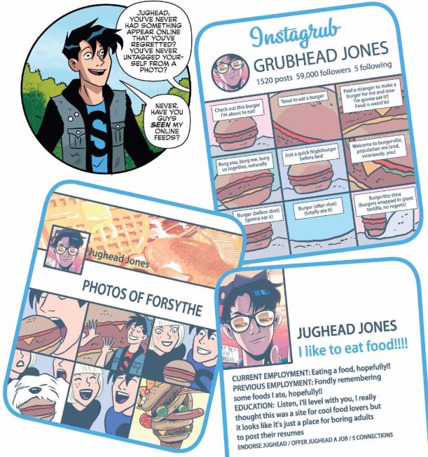 Jughead’s social accounts are pitch perfect. Derek Charm captures the feel of social media while also reinforcing the point that Jughead is not overly precious with that appears online. Details like including the food Jughead and Sabrina are subtle references to previous issues that don’t distract from the story but situate Jughead in the book’s universe. Jughead doesn’t care about the path he leaves online, posting a LinkedIn profile just so he can be sassy about the site itself. Of course, his approach works for him, giving him a follower/follower ratio that Reggie would kill for.