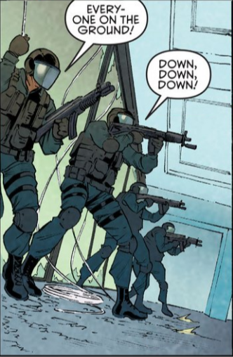 The case of the vanishing SWAT team threw me on my first couple reads too, but let’s investigate that moment further. I’m going to repost the panel you posted, Mark, but I’m also going to include the next few panels as well, because that context reveals a lot.