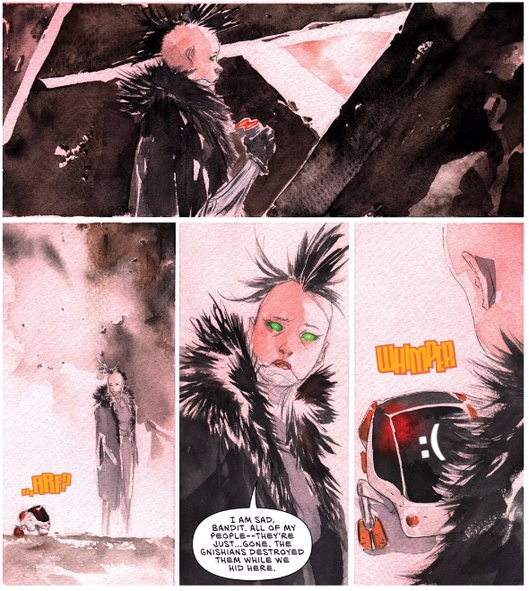 Again, I adore the specific textures Nguyen uses to paint the walls of Queen Between’s hiding space, but what I specifically want to point out is the gritty haze of red and black that hangs over Sampson in every single panel. It instantly shows that this is a desolate planet, and far different from the antiseptic whites (so pure that the backgrounds often bleed into the gutters) of the UGC Council room or the Machine Moon. Actually, those similarities might be just as important as the differences; if Sampson’s appearance sets it apart from those other settings, then does that mean that the UGC Council and the Hardwire are more alike (even if just in method, rather than ideals) than they’d like to admit?