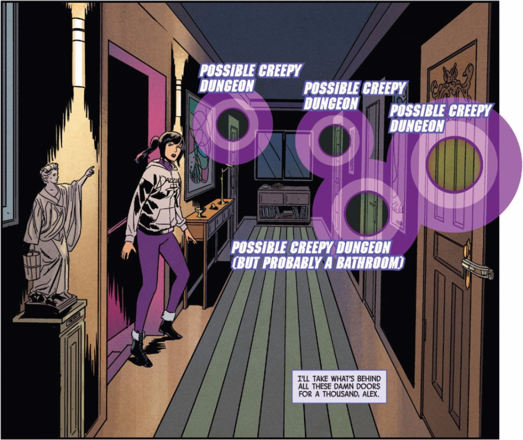 What’s funny is that, just two pages earlier, Kate zeroed in on a seemingly invisible “spatial disparity” in the living room, one that she deduces must be hiding something devious. She obviously can notice these things, but they aren’t exactly instincts yet, so instead she has to walk in on a few awkward situations before finding the room she’s actually looking for.